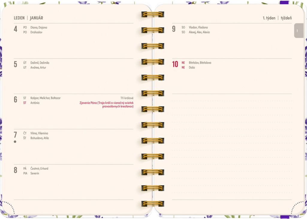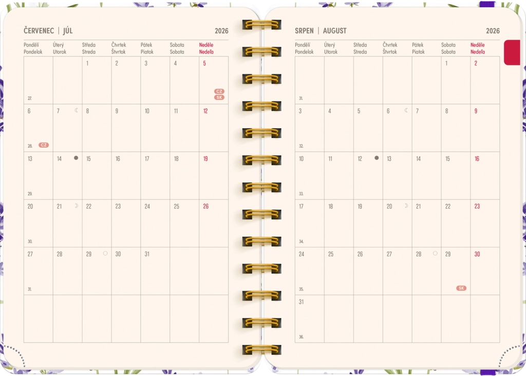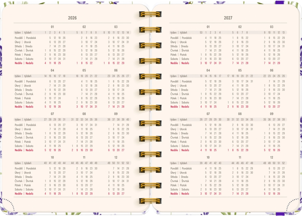 The elegant 18‑month Petito planner in a lavender motif combines clarity and style for planning from July 2026 to December 2027. It offers a weekly lined layoutCzech and Slovak names and holidays, monthly overviews for 2026 and 2027, and plenty of space for notes each week.