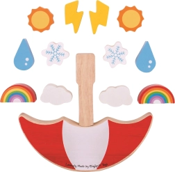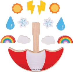 The set includes 13 pieces featuring iconic weather symbols: rainbow, cloudiness, snowflake, drop, sun, and lightning. Bright colors support color and shape recognition, and responsibly sourced wood ensures long life and a pleasant feel. The game meets European safety standards and is a great choice for children aged 2 and up.