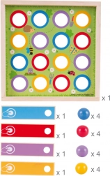 A fun family game for children from 3 years that develops fine motor skills, reflexes, and hand–eye coordination. The goal is to use the launchers to flip the colored balls into the matching holes on the board. A game for 2–4 players in red, blue, yellow, and purple. Made from responsibly sourced wood and meets European safety standards.