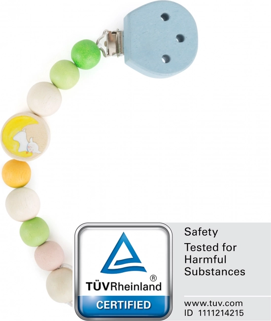 Made from quality wood with a smooth surface and safe, non-toxic paints. Saliva resistance and robust workmanship ensure long service life. The universal loop fits most ring-style pacifiers.