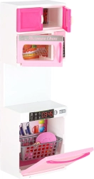 The set includes rich accessories: pots with lids, a pan, a toaster with a movable lever, dishes, mugs, cups, a “milk carton,” kitchen utensils on hooks, and “ice cubes.” Opening cabinets, a pull-out drawer, and shelves teach kids tidiness while developing fine motor skills and social abilities.