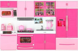 The set includes a microwave and dishwasher, a stove with oven, a display cabinet with sink, and a fridge with drawer. Kids can enjoy a complete scenario of cooking, baking, and cleaning.