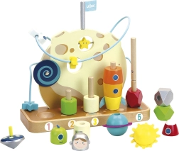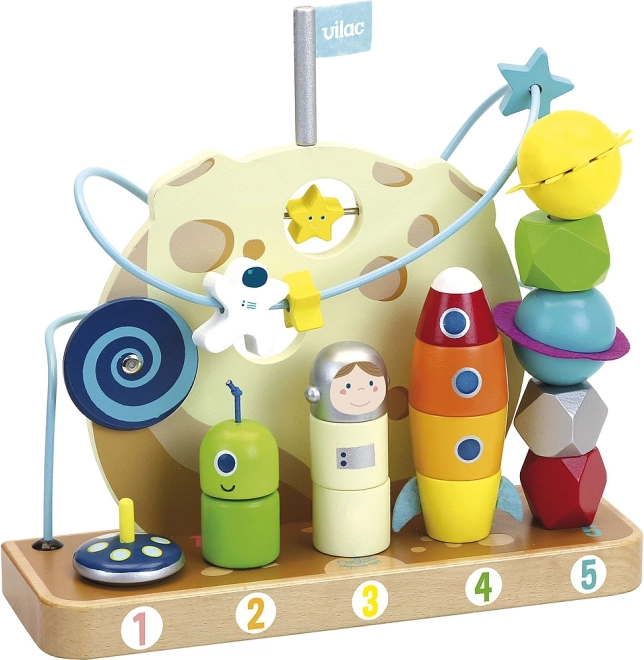 Discover a fun wooden toy with a space theme that teaches children to count in a playful way while developing fine motor skills. Sliding stars on a wire, stackable planets, a Martian, an astronaut, and a rocket inspire imagination and learning. Ideal for a first introduction to math skills and hand-eye coordination.