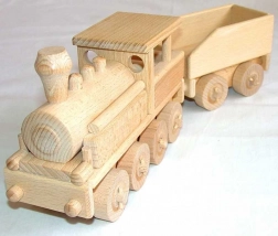This wooden model of a steam locomotive stands out with precise craftsmanship of beech wood and a natural design enhanced only by waxing and polishing. The locomotive has movable wheels and is designed without sharp edges, ensuring safe play for children. This makes it suitable not only for play at home but also at the sandbox.