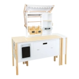 Includes a scale, drop-down shelves, drawing boards, a coffee machine, and storage space with boxes, which encourage children's creativity and inspire endless games.