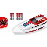 - Batteries included—2× AA for the controller and 3× AA for the boat.