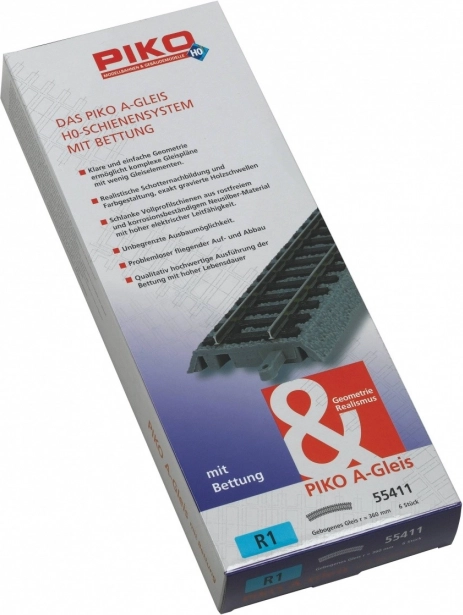 The curved track from the brand Piko offers precise and detailed reproduction of wooden sleepers on ballast, ensuring an authentic look for your model world. With a radius of 360 mm, the track is suitable for various setups and closely mimics real railways.