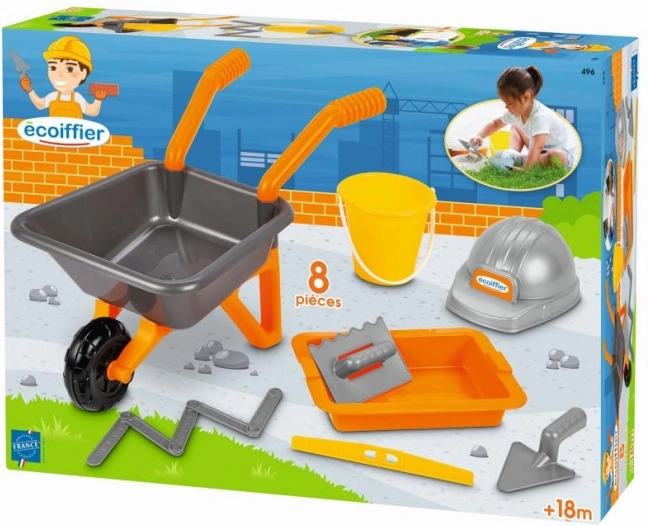 Super set for sandy construction sites, 8-piece. Wheelbarrow, bucket, spirit level, folding ruler, mason's trowel, float, bowl, and work helmet.