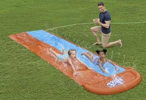 Enjoy summer to the fullest with the double water slide H2O GO! by Bestway, measuring 4.88 m. Two lanes for racing, integrated water jets for maximum slipperiness, and a soft inflatable splash pool ensure safe, endless backyard fun.
