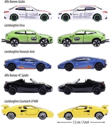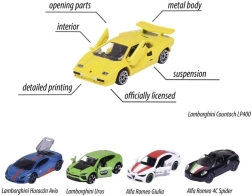 The box includes a selection of legendary vehicles: ALFA ROMEO 4C Spider, LAMBORGHINI Countach LP 400, LAMBORGHINI Huracán Avio, LAMBORGHINI Urus, and ALFA ROMEO Giulia. Thanks to articulated parts and functional suspension, the ride is smooth and realistic. Perfect for kids aged 3+ and as a stylish addition to any collection.