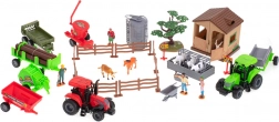- Fold-out stable, 2 tractors, 3 trailers/attachments (e.g., planter, baler, bale trailer), silo, tree, 8 wooden fence pieces, 8 connectors (bases) for fencing, 6 brick pieces, trough/waterer, farmer figures, animals, warning signs and other accessories