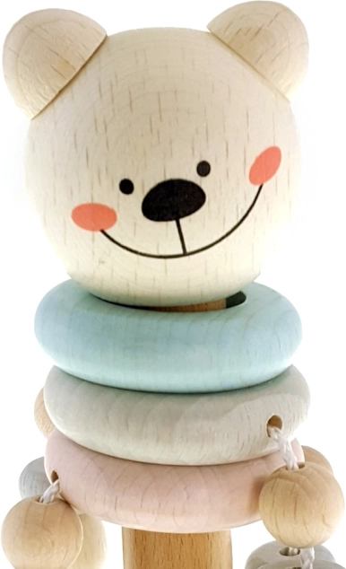 A cute wooden teddy-shaped rattle with softly chiming bells will delight every baby. The toy features pastel colors, supports fine motor skills, and is made from certified wood with eco-friendly, durable paints. 100% made in Germany.