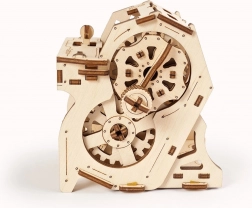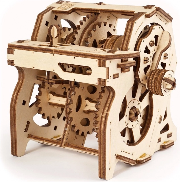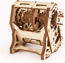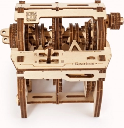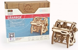Assembling the four-speed gearbox model reveals the workings of mechanics, demonstrating gear shifting, reverse, and neutral. The model is made of plywood and offers interactive learning through augmented reality with the UGEARS app. Enhance the experience by scanning the QR code with your mobile phone.