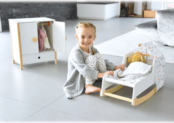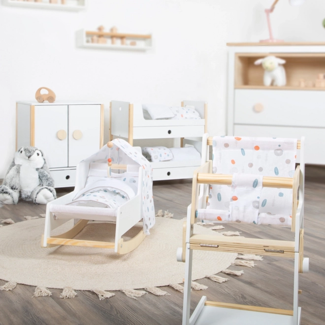 A stylish Nordic-style doll cradle for children aged 3+. It features a stable wooden frame, rocker runners, an easily removable canopy, and reversible gender-neutral bedding. Under the large blanket, dolls and plush toys up to 46 cm can sleep comfortably. Elegant pastel tones and rounded edges fit perfectly into a modern kids’ room.