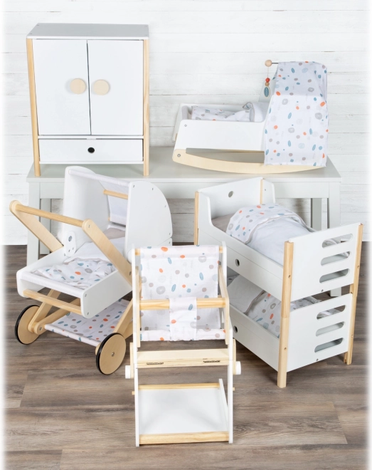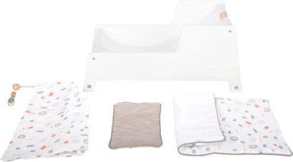 Included are reversible, neutrally toned bedding and a large blanket under which dolls or plush toys up to 46 cm fit comfortably. The soft colors and minimalist lines make it a tasteful addition to any interior and support creative and pretend play.