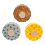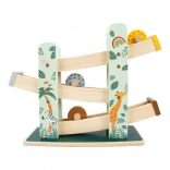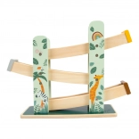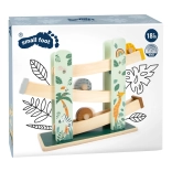 This beautiful wooden track offers children the opportunity to watch as three wheels, each with a unique design, roll down the three ramps. It is decorated with illustrations of animals living on safari and plants from the jungle.