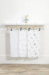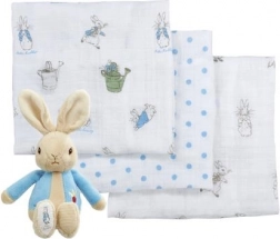 A beautiful gift set that includes 3 muslin diapers and a plush Peter Rabbit. The diapers are made of 100% cotton, washable, and each features a different print.