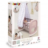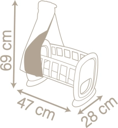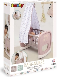 A stylish cradle with a canopy from the Baby Nurse range, ideal for pretend baby care. It offers gentle rocking, a stable construction, and a textile canopy with a delicate pattern. Suitable for dolls up to 42 cm (doll not included).
