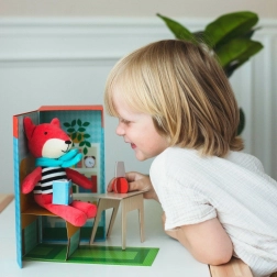 Meet the adorable fox Frances, who loves stories and the comfort of his yellow chair. This set combines a soft plush friend with a creative play scene in the form of a library and a foldable book with English text. Ideal for bedtime reading and imaginative play.
