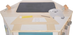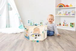 A large wooden motor skills cube in a hexagon shape offers 8 sides packed with activities for children from 12 months. Thanks to the double-sided lid with a bead maze and train track on one side and a chalkboard on the other, kids enjoy both creative and motor play. Includes 3 toy cars, a jingle bell to stimulate hearing, and a practical storage space. The stable build from quality wood with rubberized feet protects floors and fits any interior.