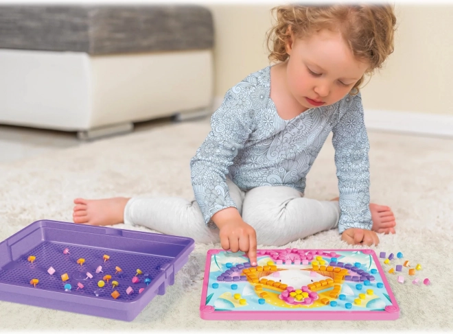 Discover a creative world with the Quercetti peg mosaic featuring fairy-tale themes. Children practice fine motor skills, hand–eye coordination, and creative thinking by placing colorful pegs into pre-printed pictures. The set includes up to 300 pegs in 2 shapes and 6 colors, 8 cards with fairy and story motifs, a pegboard, a frame, and a practical storage basket.