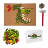 The set includes a cork board, wooden hammer, colorful pieces, and push pins for creating pictures.