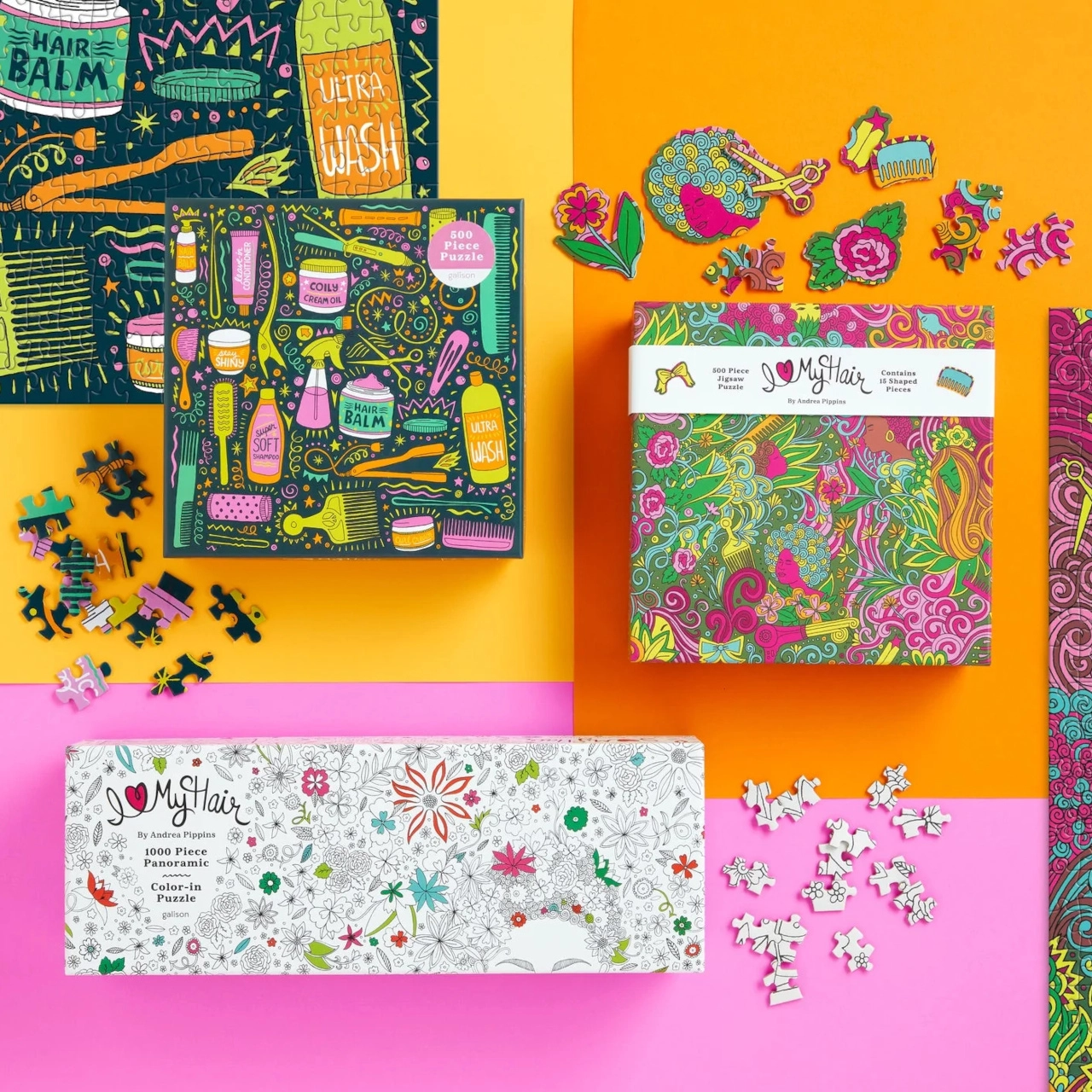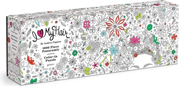 Discover creative relaxation with a panoramic puzzle you can both assemble and color. Illustration by artist ANDREA PIPPINS features floral and hair motifs, turning the finished piece into a unique artwork. Made from recycled paper with a matte finish for accurate colors, 1000 precisely cut pieces, and premium printing with non-toxic inks.