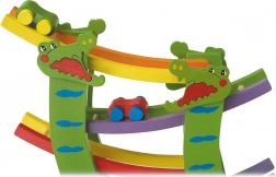 This wooden crocodile racetrack turns a child’s room into a small racing circuit. Kids place a car at the start and watch it swiftly glide down each level to the finish. Bright colors and the cheerful crocodile theme invite play again and again.