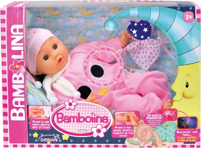 The beautiful Bambolina Jasmine doll can say up to 50 Czech words. When you press Jasmine’s tummy, she starts talking. Come play with her—she’ll tell you, for example, “Mommy, I love you.”