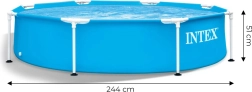 Enjoy the summer with the compact garden pool INTEX Metal Frame 244 × 51 cm. The stable steel frame, durable three-layer PVC material with nylon reinforcement, and quick 30-minute assembly make this round pool an ideal choice for families. It offers a capacity of 1,828 l, option to connect a filter pump, and a drain valve for easy emptying.
