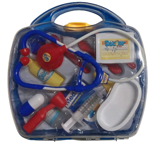 - stethoscope, syringe, bowl, 'medicines', reflex hammer, and other accessories