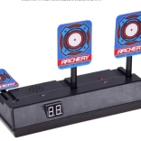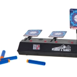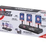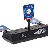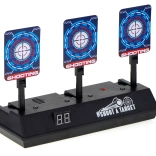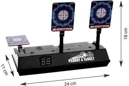 The target can be used with foam dart guns and provides a realistic experience thanks to sound and light effects. Upon impact, you'll hear shattering glass or applause sounds. The target is equipped with a digital counter that records scores. It resets automatically after hitting all three targets.