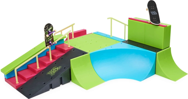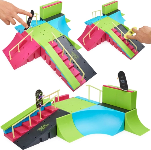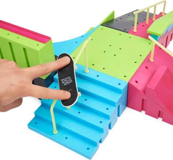 The neon Tech Deck skatepark turns any table into an action arena for fingerboarding. With colorful ramps, stairs, rails, and bowl/quarter features, you can easily practice ollies, grinds, and transitions. The two included fingerboards let you start immediately and swap tricks with friends.