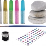 Three natural smooth stones, a brush, black paint, five metallic shades, and sparkling gems – start creating right after unboxing.