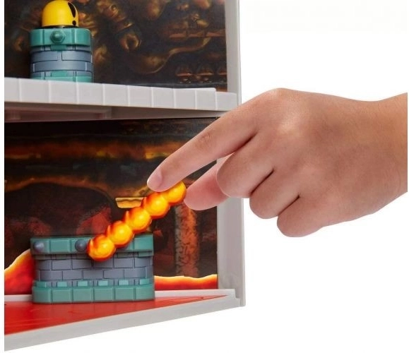 The Deluxe Super Mario and Bowser’s Castle playset with sound lets you explore this classic level from the Super Mario video games. The set includes exclusive 9 cm Bowser figures in an interactive environment with working mechanisms and authentic in-game sounds. You can move the elevator up and down, spin the fireballs, open the bottom of the cage, and defeat Bowser by triggering the trapdoor to drop him into the lava below.