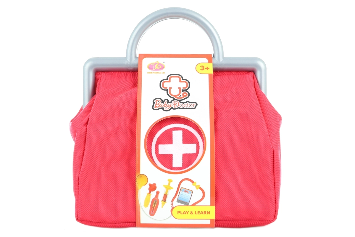 The doctor's set includes a plastic stethoscope, otoscope, syringe, name tag, and thermometer. Bag dimensions approx. 20 x 22.5 x 8.5 cm. Age 3+
