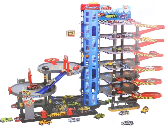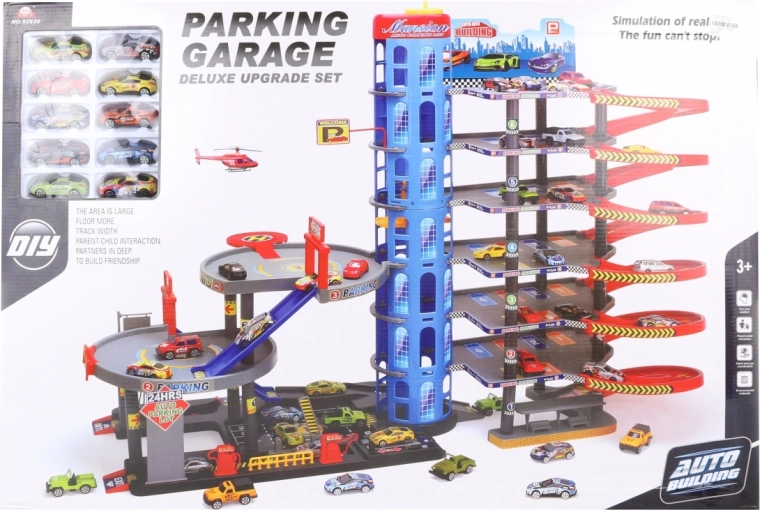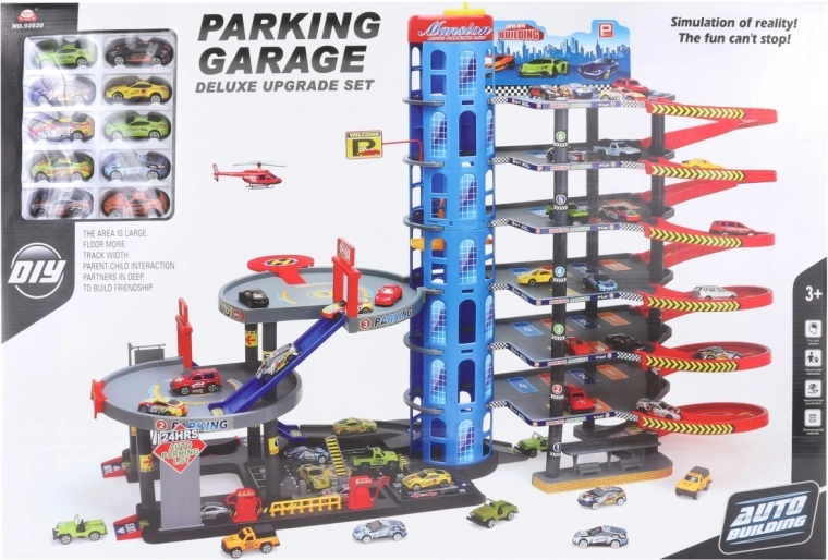 This spacious multi-storey garage offers kids hours of creative play. Six levels are connected by ramps and exits so the cars can race, park, and safely move between floors. The rooftop helipad adds a new dimension and supports urban storylines.