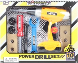 A fun and safe kids’ tool set with a realistic battery-free drill that spins and buzzes when pressed. Includes a screwdriver, wrench, wooden strips, and screws for creative building. Ideal for children aged 3+.