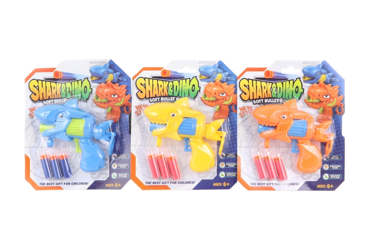 A fun plastic pistol in the shape of a shark for action-packed play indoors and outdoors. The package includes 3 foam darts with suction cups for safe play. Ideal for children aged 6 and up. Lightweight, safe, and easy to handle blaster for quick fun.