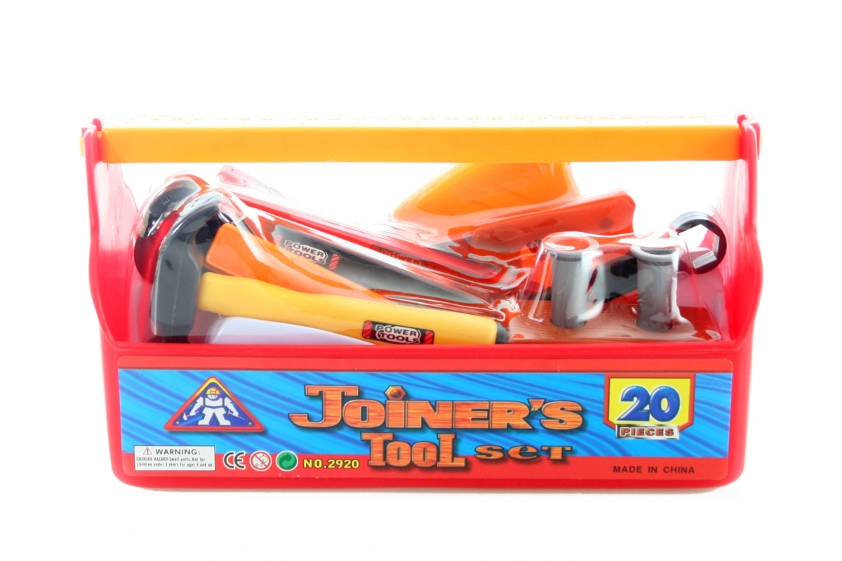 - Set includes: hammer, knife (plastic), screwdriver, wrench, saw, ruler, pliers, and screws