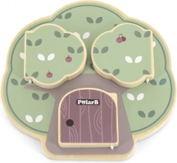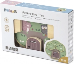 The Peek-a-Boo Tree wooden game by POLARB is designed for playful discovery. Children slide and turn pieces, knock on doors, and find the tree’s cute residents—an owl, a squirrel, and a hedgehog. This interactive toy naturally develops hand-eye coordination and fosters curiosity.