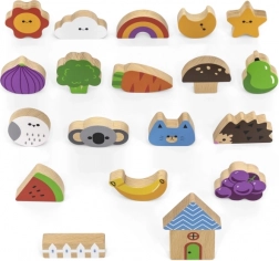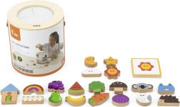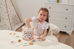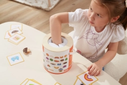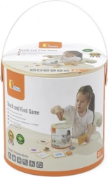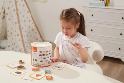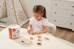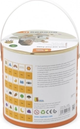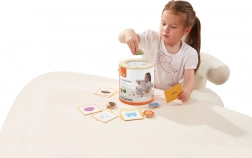 Catch and Find game. The set includes 20 blocks, a paper bucket, 20 playing cards, and a lid. Package dimensions approx. 16 x 15.5 cm. Age 3+