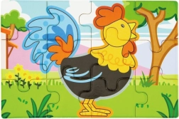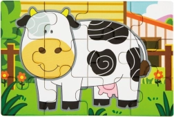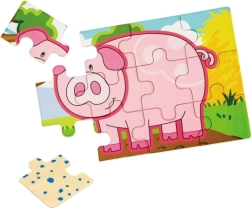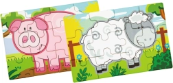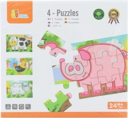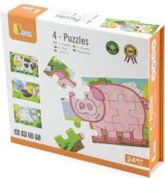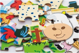 Wooden puzzle with farm themes. The package contains a total of 4 pictures (48 pieces in total). You can assemble one long picture of all 4 animals from the puzzles. Package dimensions approx. 20.5 x 19.5 x 4.5 cm. Age 24m+