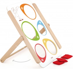 The game includes a stand with a wooden frame and three bean bags, which can be easily transported thanks to the foldable design.