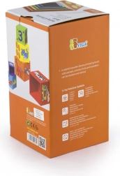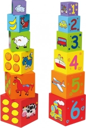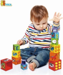 Each side of the block is decorated with different motifs, such as animals, numbers, fruit, and vehicles, which enrich children's imagination.