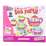 - Ceramic teapot, 2 cups, creamer, sugar bowl, 6 paints, brush, instructions