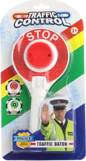 Police paddle with light. It shines red on one side and green on the other. Powered by 2x AA batteries (included). Paddle size approx. 23 cm. Package dimensions approx. 30 x 16 x 3 cm. Age 3+