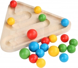 Discover creative fun and learning in one. The wooden double-sided triangular board brings two activities: sorting colored balls according to 20 templates using the included tweezers and spoon, and a dynamic maze that helps children practice patience and precision. After playing, the colored balls are stored in the linen pouch to keep everything together.