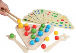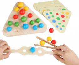 Children sort colored balls using tweezers and a spoon according to the patterns on the cards — great for developing fine motor skills, focus, and color recognition.