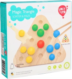 The double-sided wooden game Magic Triangle 2-in-1 by LUCY & LEO develops fine motor skills, logical thinking, hand–eye coordination, and memory. It offers two play modes — a sorting game with pattern cards and a maze — and is a great Montessori tool for children.